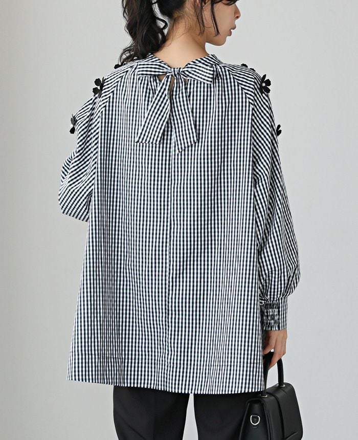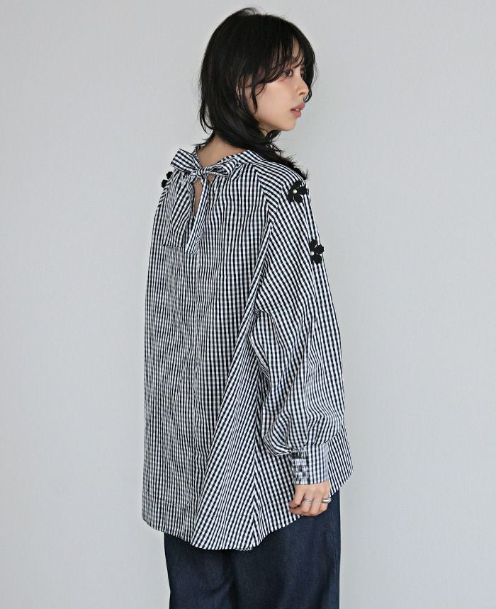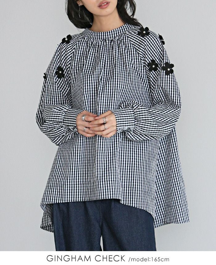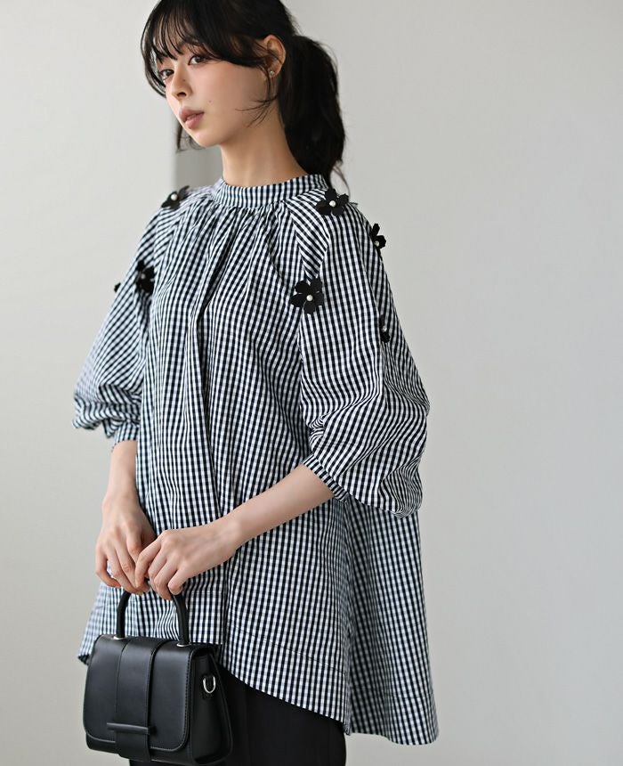 立体的な花のモチーフを散りばめ、パールで飾り付けしたブラウス。