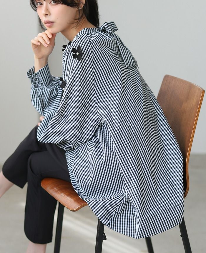 ギャザーを入れたモックネックは、後ろでリボンを結ぶデザイン。