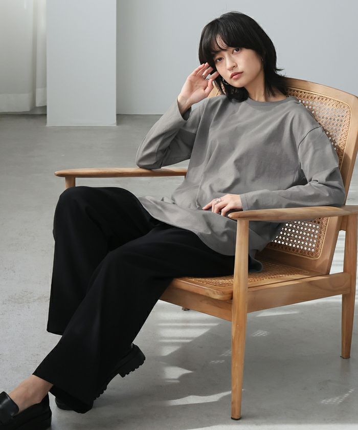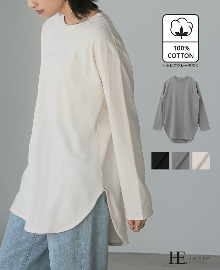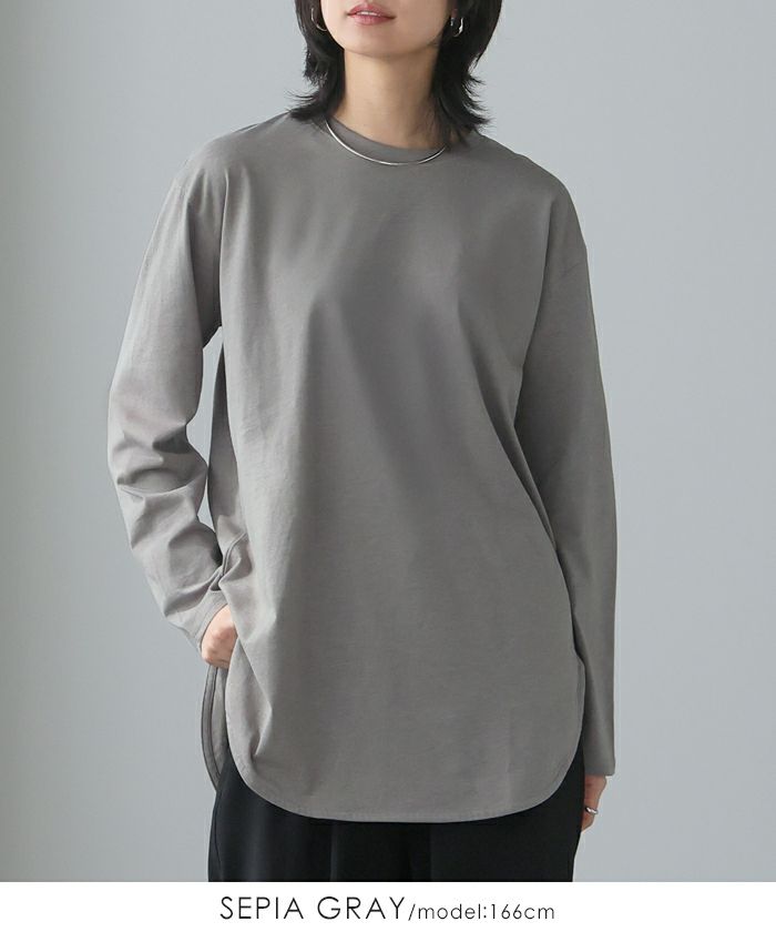 『長く着れるシンプルデザイン。』気になる腰回りをしっかりカバーしてくれる、ロング丈の長袖Tシャツ。シンプルなデザインで、レイヤードにもおすすめです。ゆったりとしたシルエットで着やすく、サイドがラウンドしているのでスッキリ。さらっとした綿生地で肌触りがよく、肌が弱い方も安心して着用いただけます。普段使いにちょうどいい、大人カジュアルアイテムです。