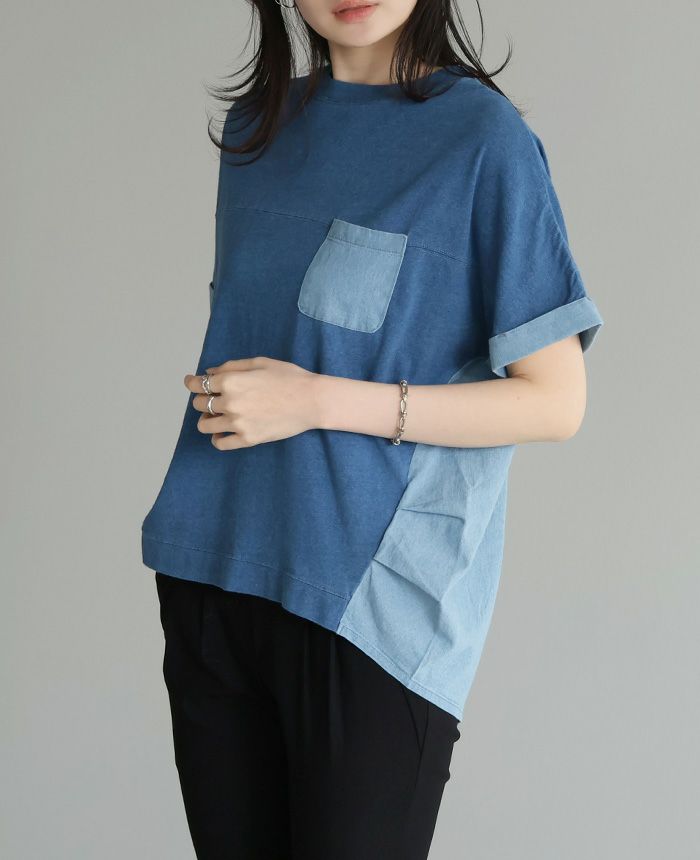 インディゴ染めのカットソーとダンガリー生地を組み合わせたトップス