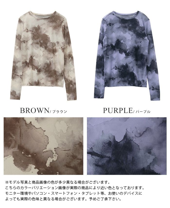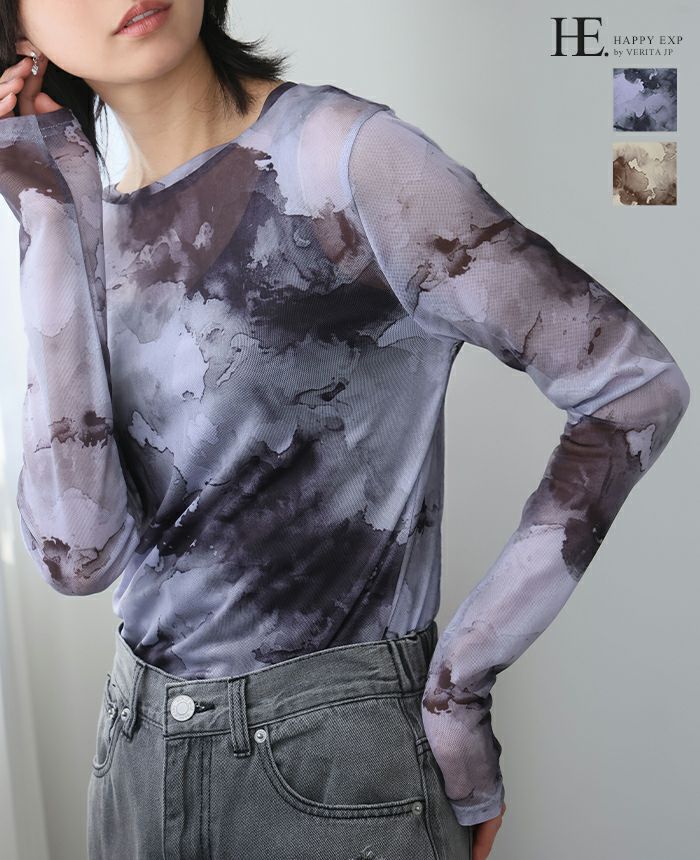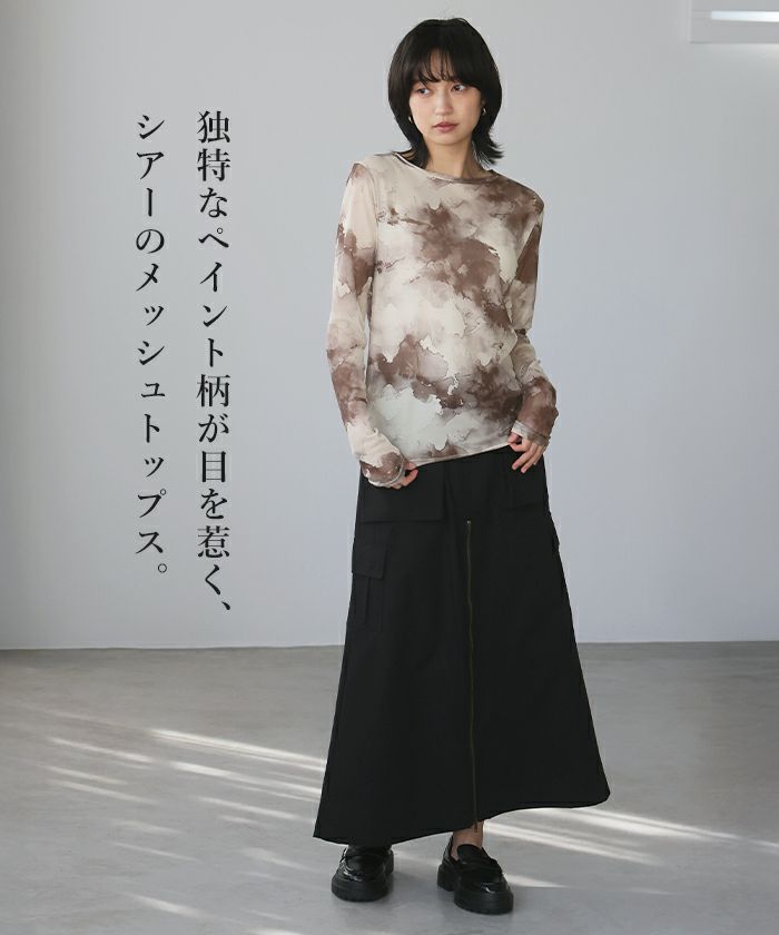 独特なペイント柄で個性的なお洒落が楽しめる、シアーのトップス。シンプルなデザインなので、どんなアイテムにも合わせられます。程よい透け感は、肌の露出が苦手な方にもおすすめ。伸縮性が高く、着心地がいいネット生地を使用。メインだけでなく、インナーとしても活躍してくれるアイテムです。