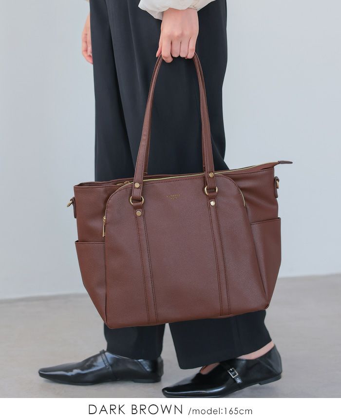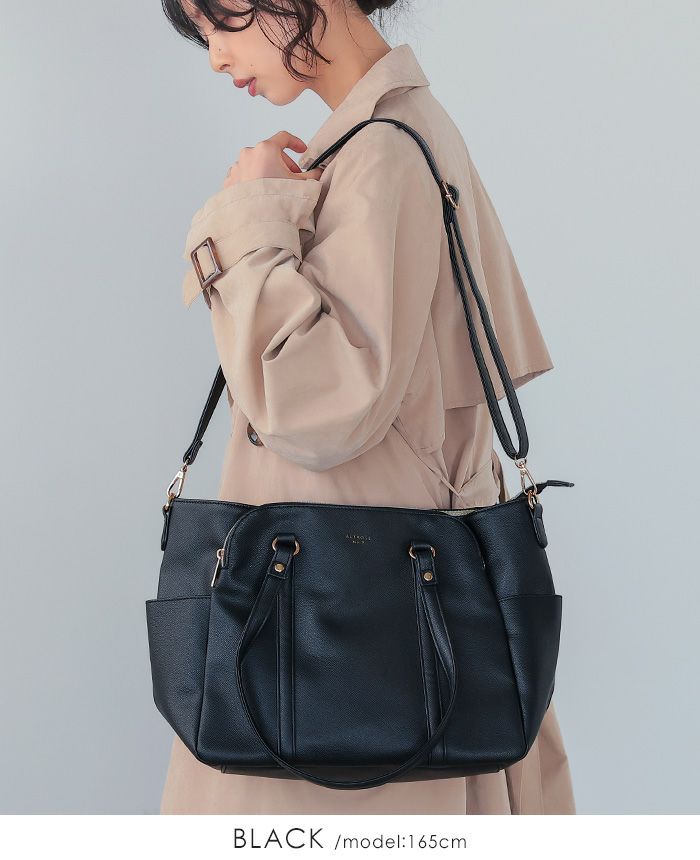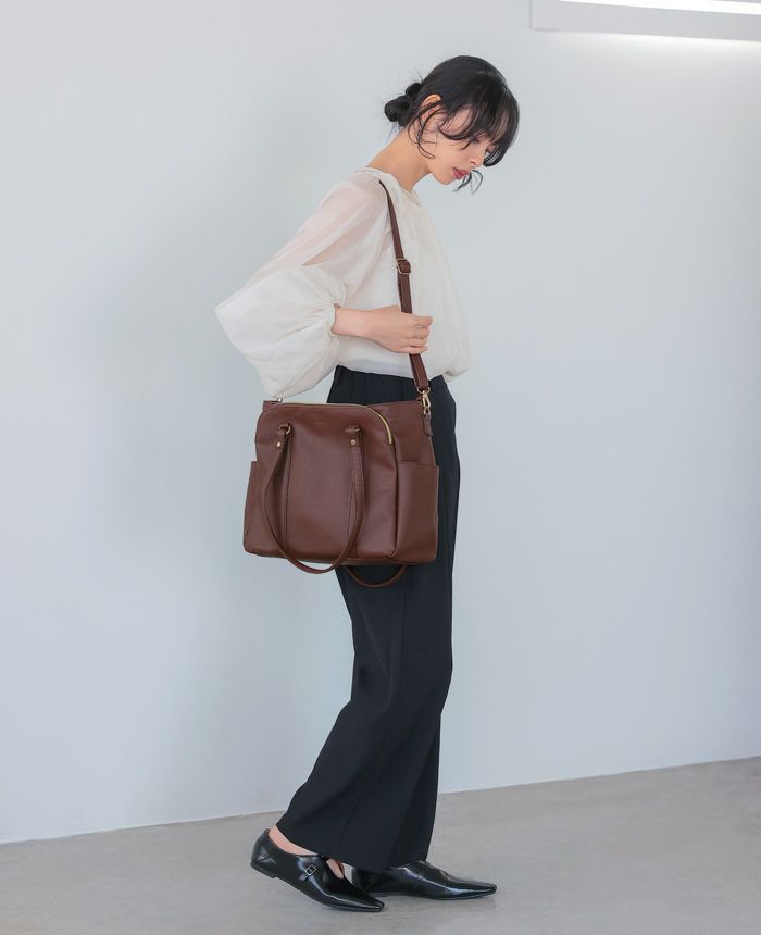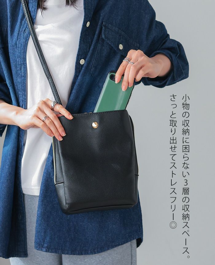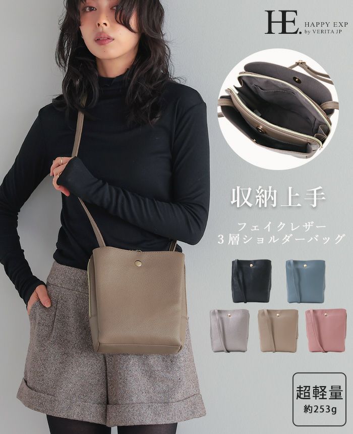 フェイクレザー3層軽量ショルダーバッグ
